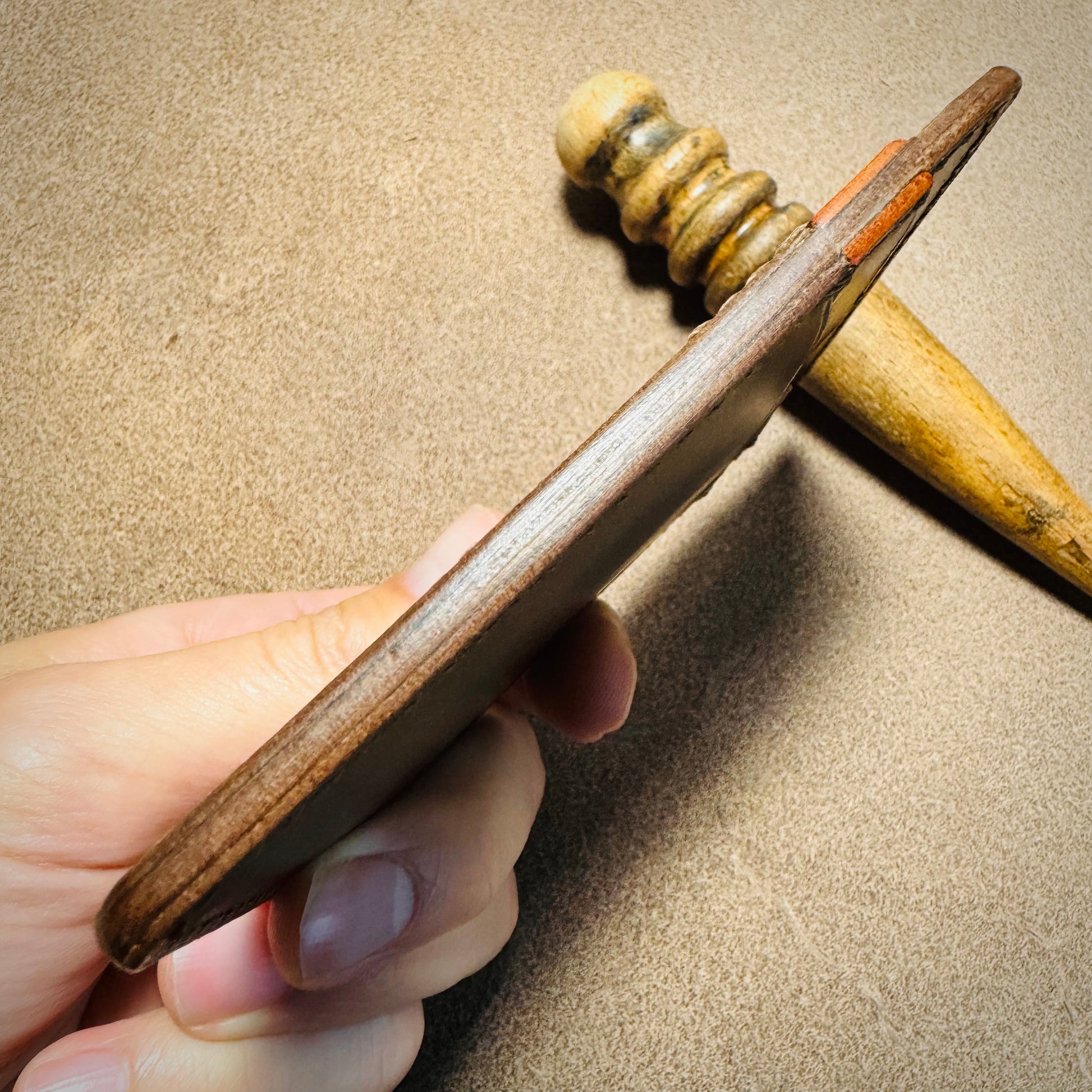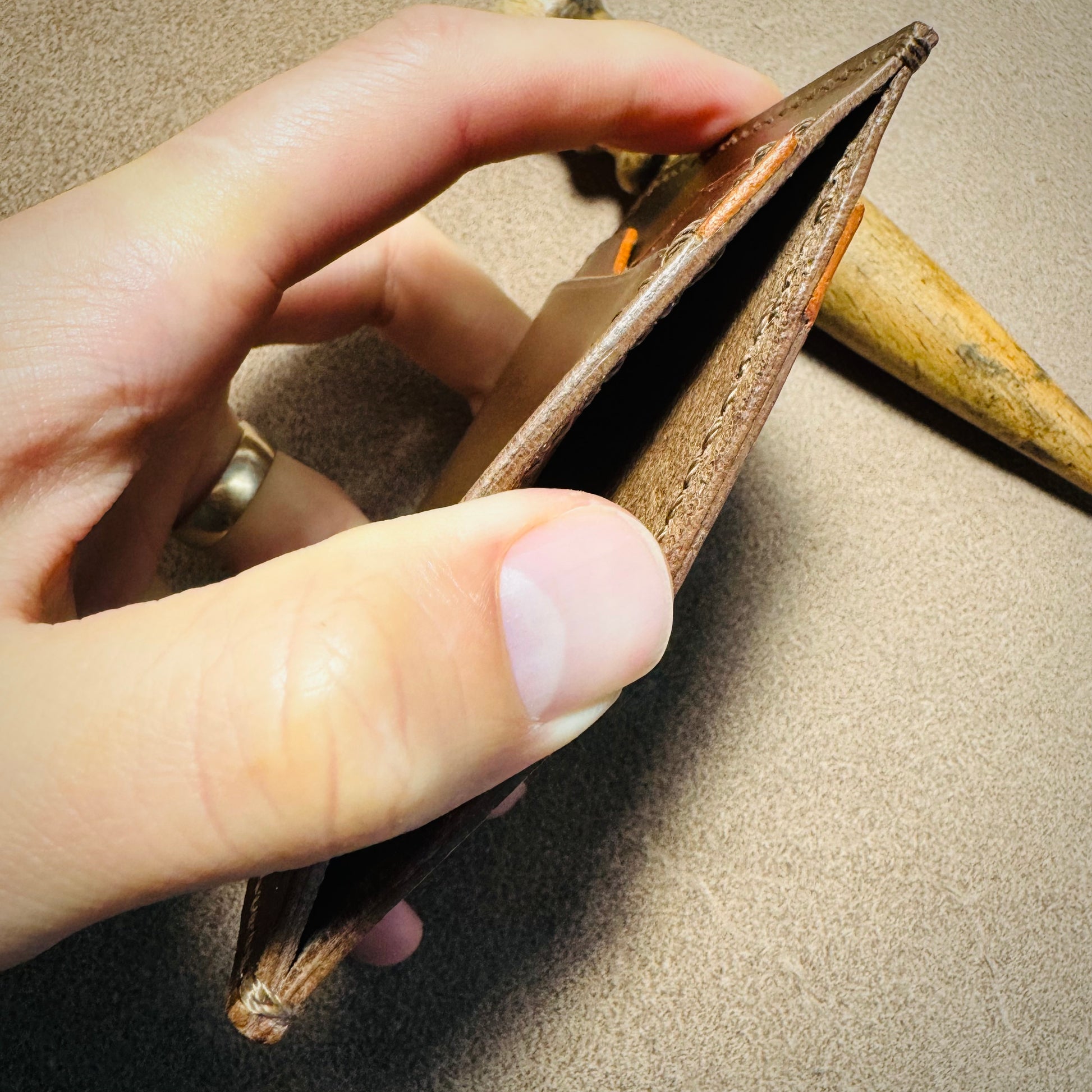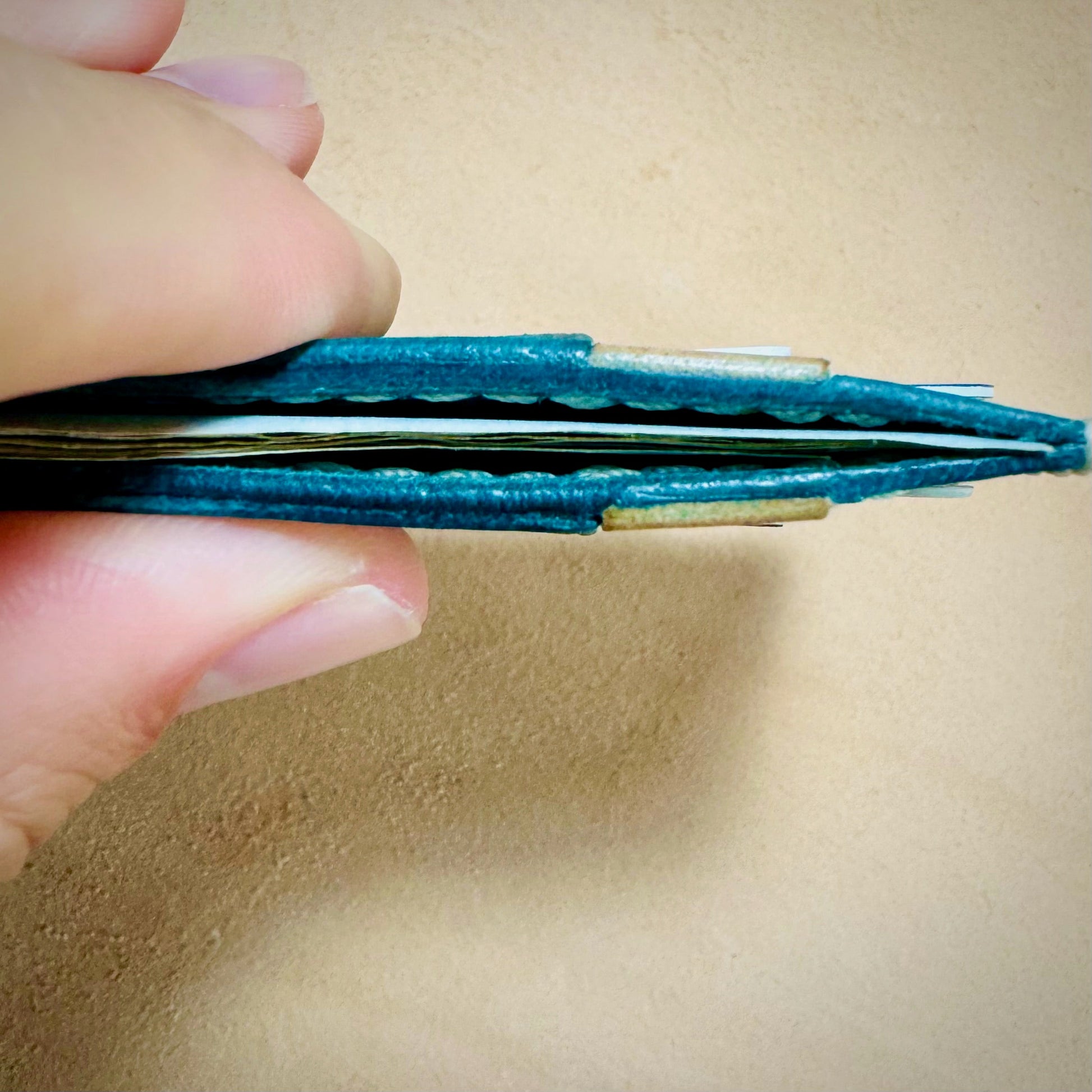 - Hand-stitched with cream Vinymo #5 thread