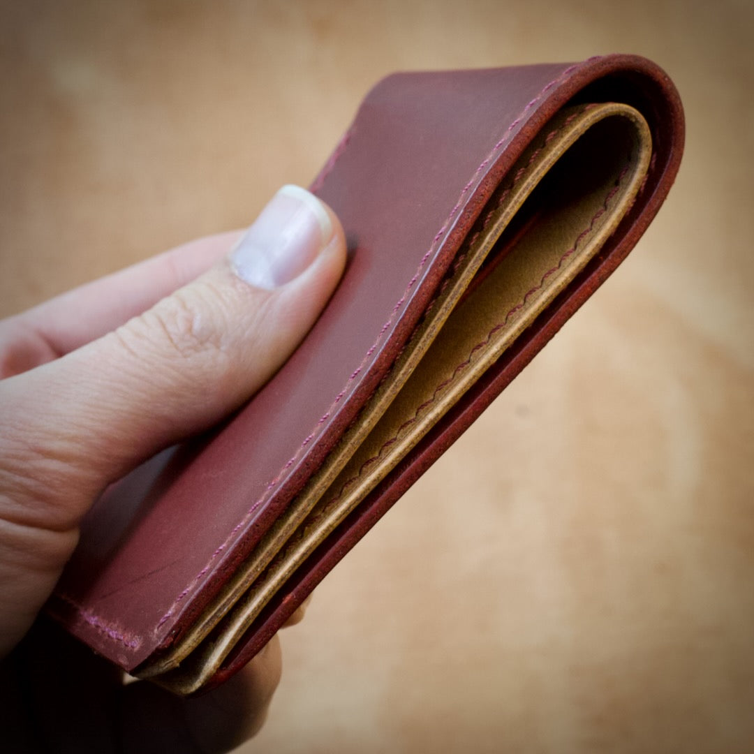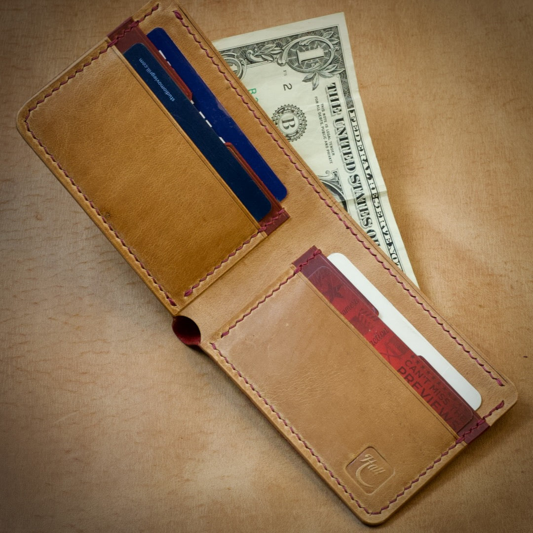If you are looking for the largest capacity traditional bifold we offer, check out our Fortissimo, which features 6 main pockets and two hidden pockets in addition to the full-length cash portion!